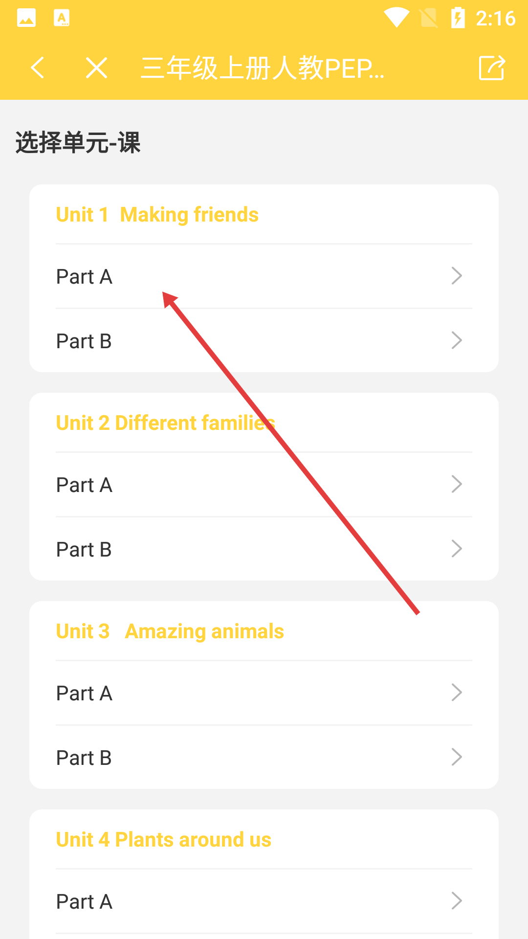 3、在“选择单元-课”页面,点击要学习的单元及部分(如【Unit1Makingfriends-PartA】)。