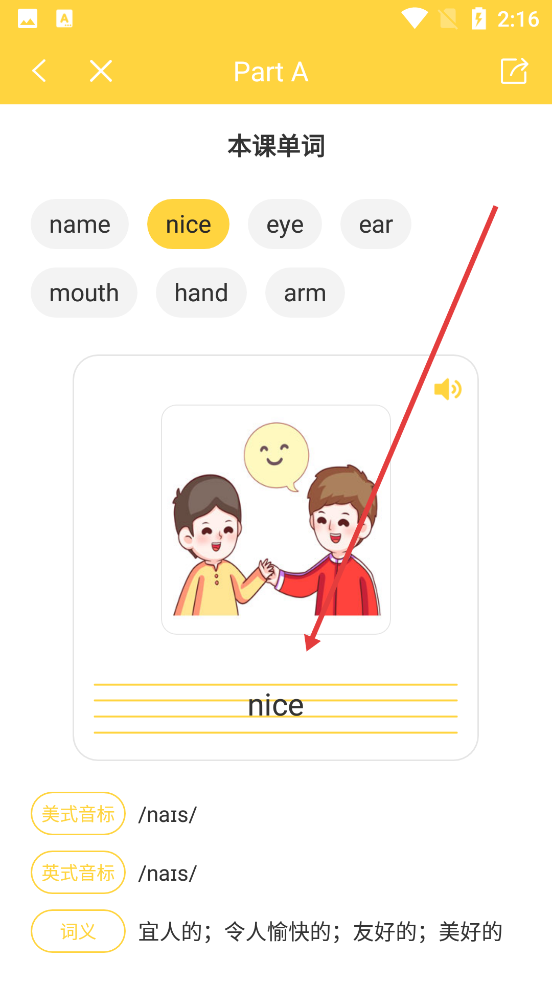 4、进入对应部分页面后,即可查看本课单词(如“nice”的音标、词义等),进行单词学习。