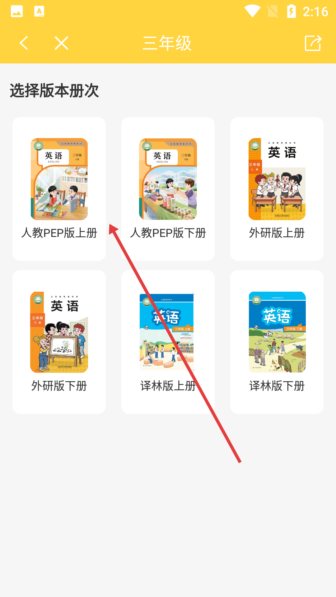 2、进入年级页面后,选择教材版本(如【人教PEP版上册】)。