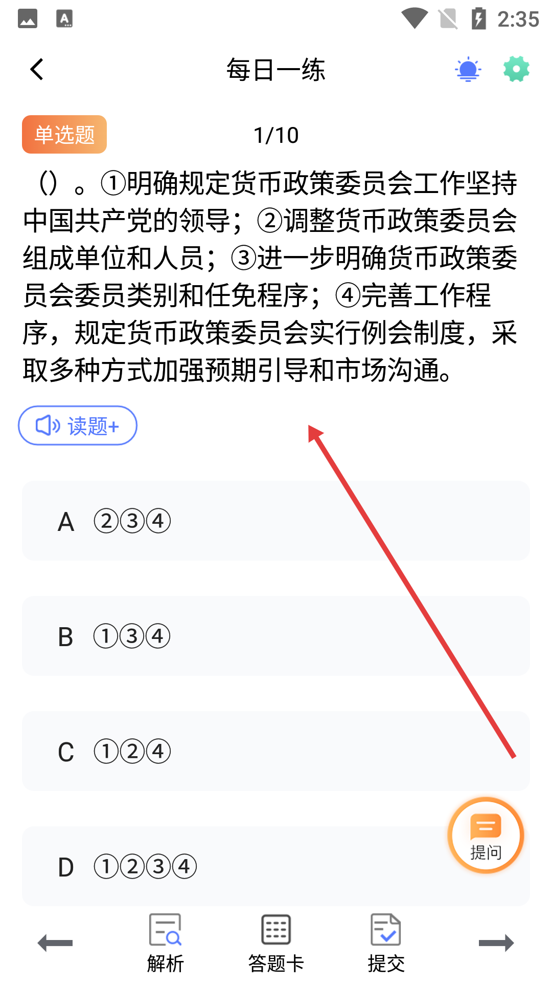 4、进入答题页面后,即可查看单选题题目并进行选项选择,完成每日一练答题。