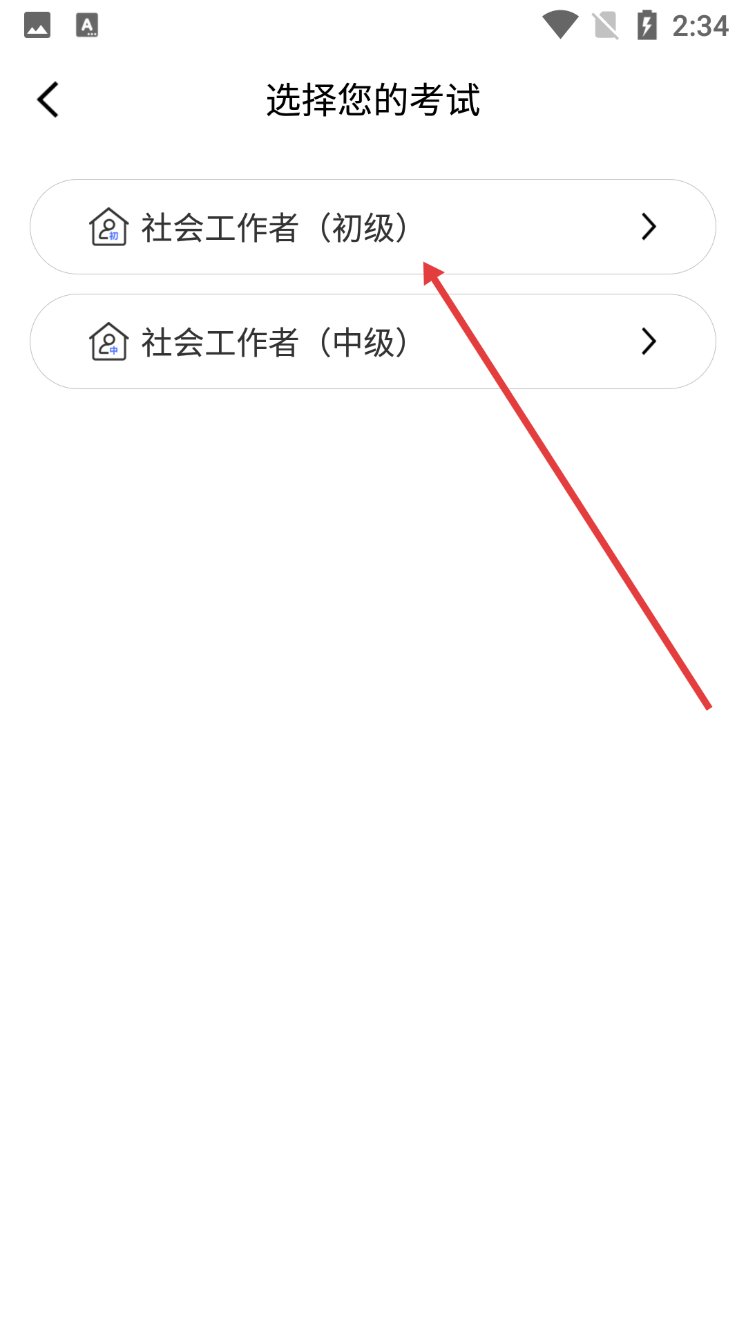 1、在“选择您的考试”页面,选择考试类型(如【社会工作者(初级)】)。