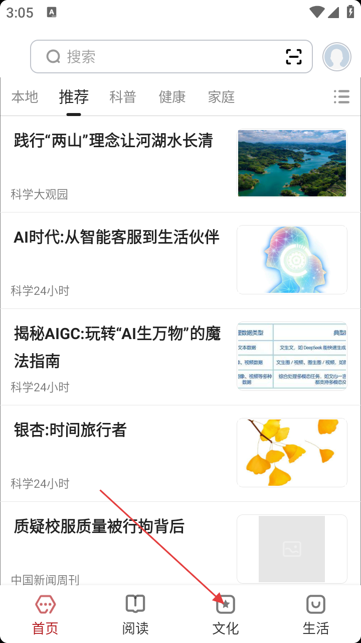 1、打开软件,进入首页后,点击底部导航栏的【文化】选项,进入文化页面。