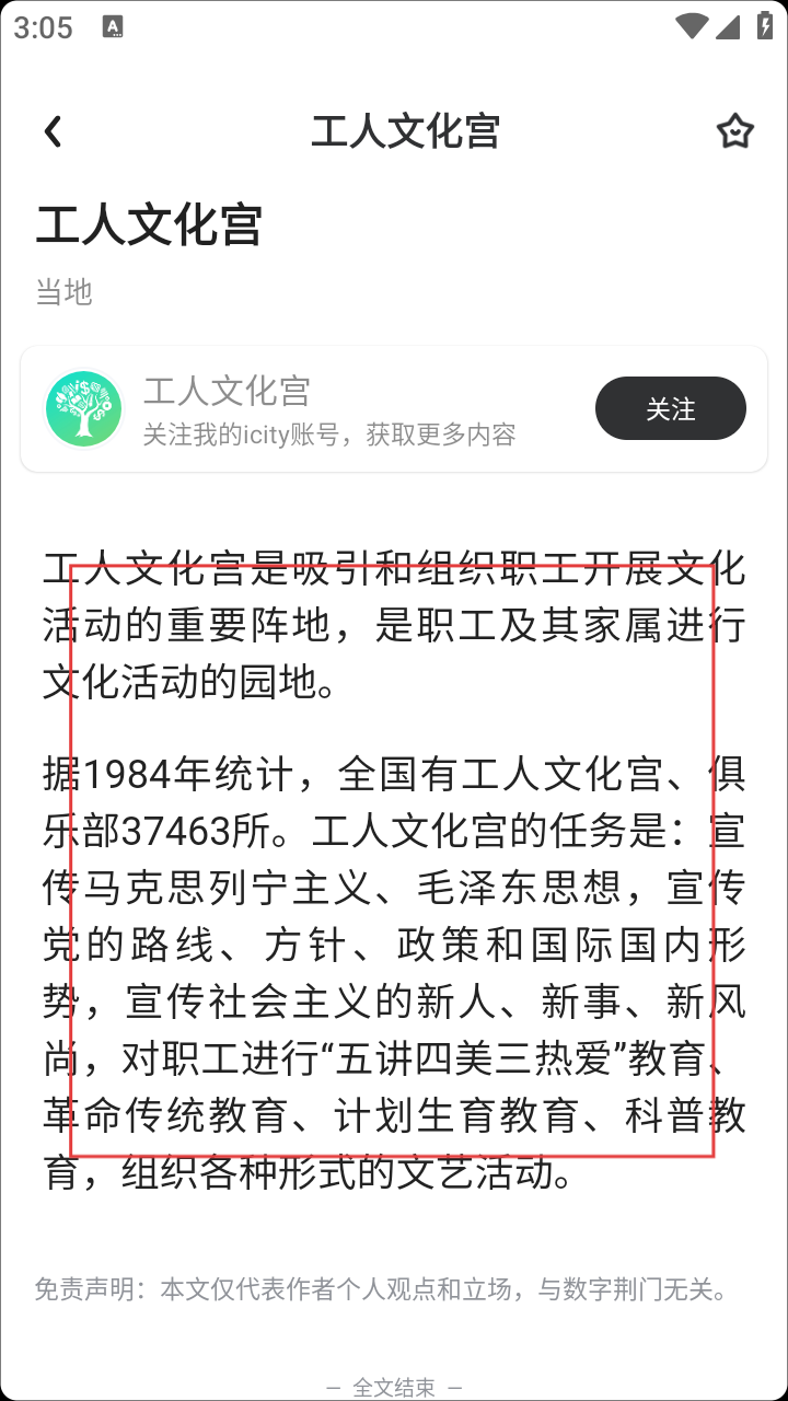 4、在文章详情页面,可阅读关于工人文化宫的介绍内容,了解其作为职工文化活动阵地的相关信息,还可点击右上角的收藏图标进行收藏。