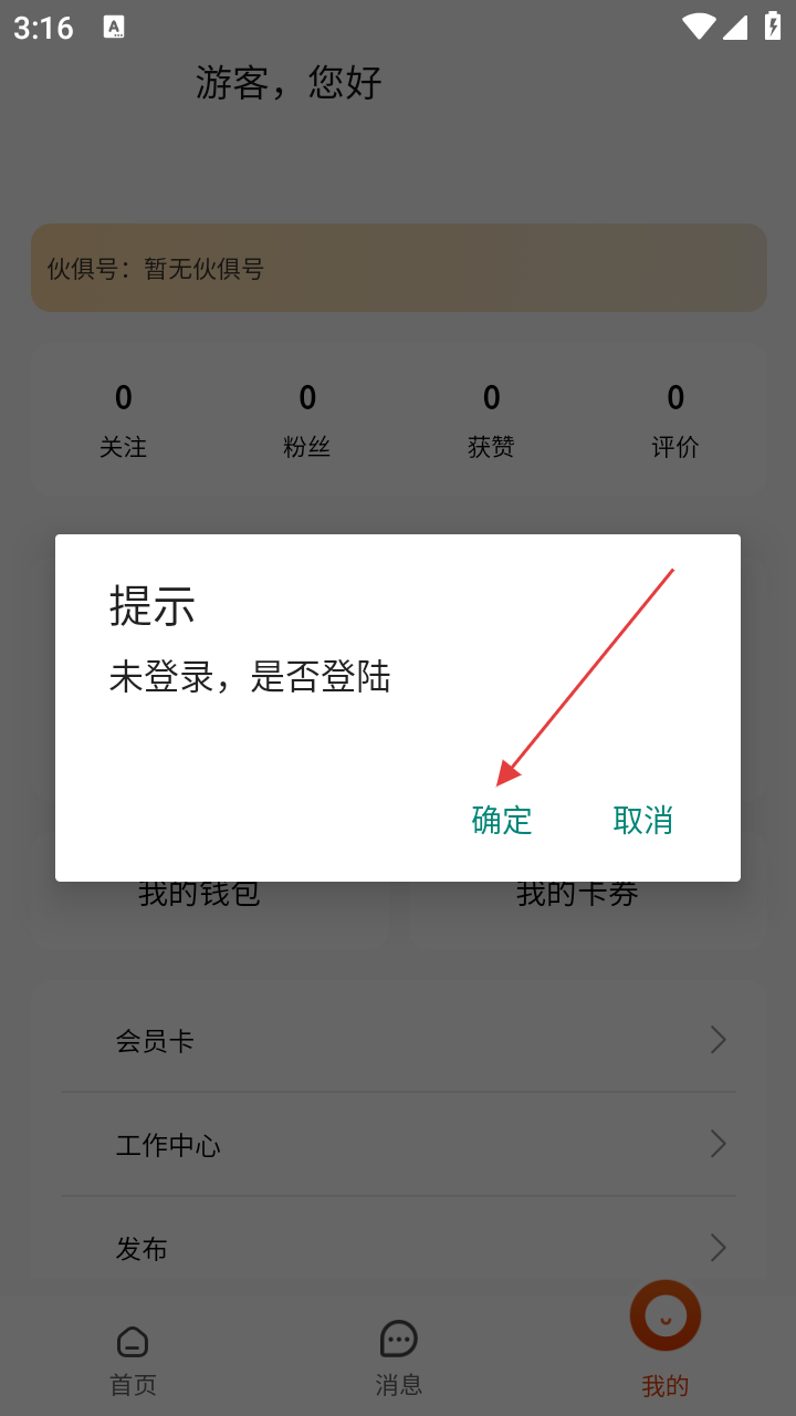 2、在个人中心页面,若弹出“未登录,是否登陆”的提示框,点击【确定】按钮,进入登录页面。