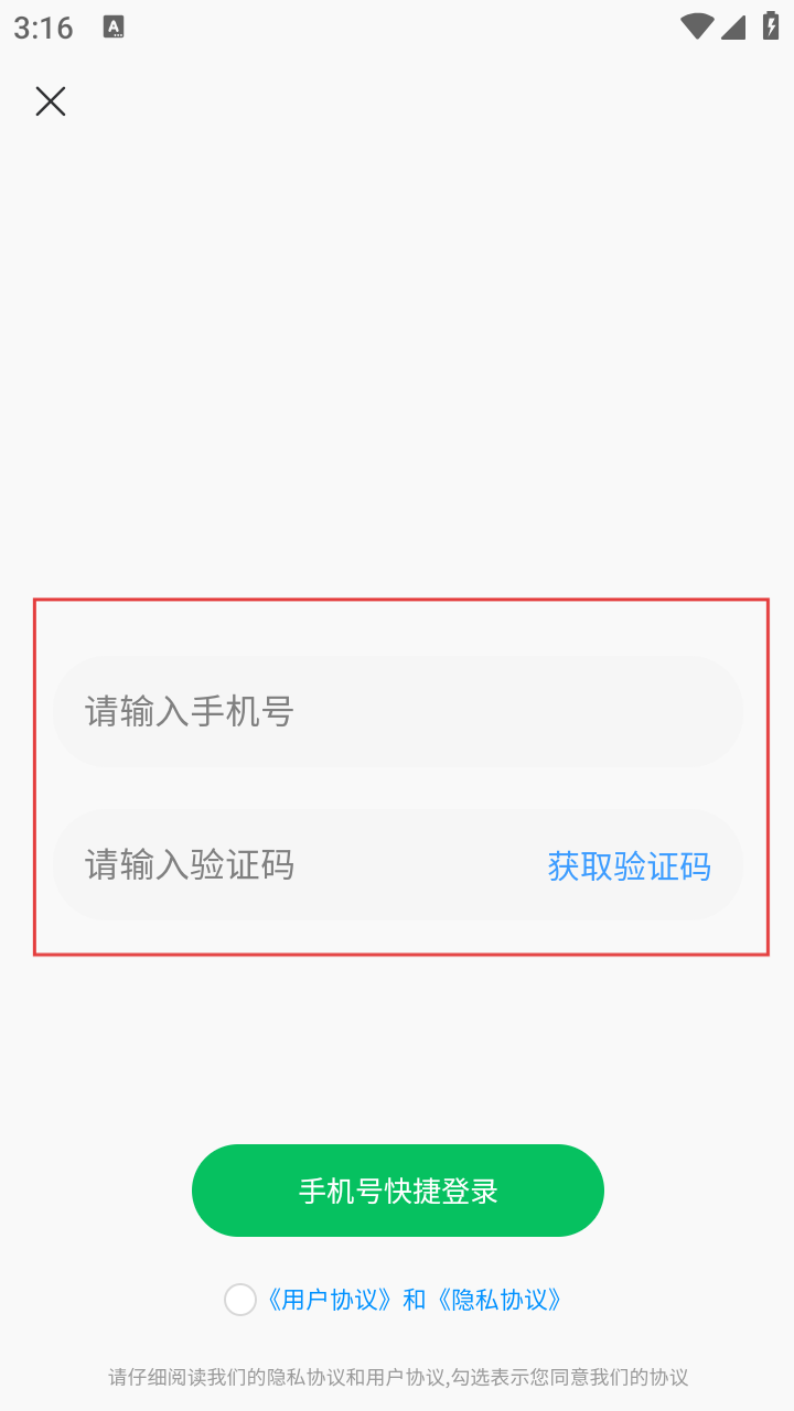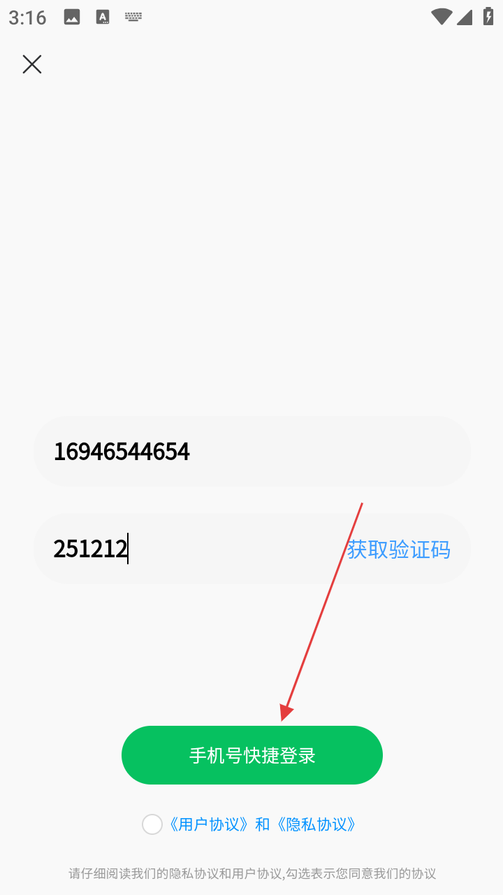 4、勾选《用户协议》和《隐私协议》后,点击【手机号快捷登录】按钮,完成软件登录操作。