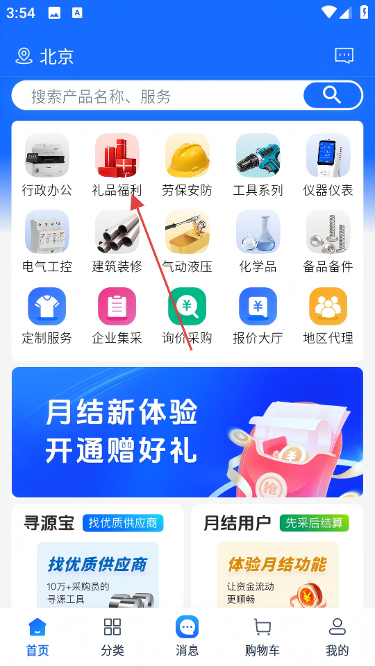 1、打开APP,在首页点击【礼品福利】,进入礼品福利商品分类页面。