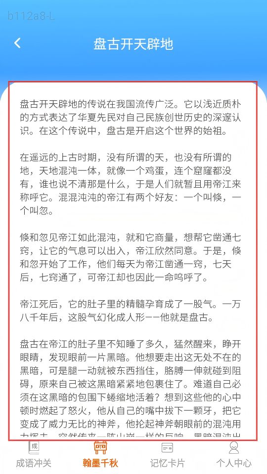 4、进入该历史传说详情页,即可查看“盘古开天辟地”的相关内容,了解其传说故事。