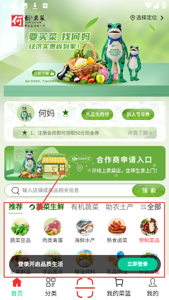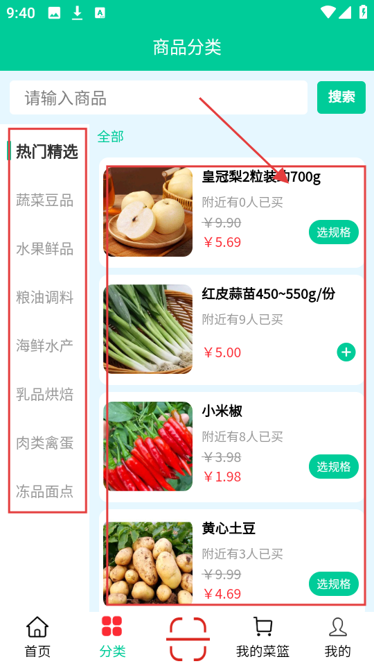 1、首页有【蔬菜豆品】【肉类禽蛋】等分类,还有搜索栏,想买菜的话,选对应品类或者搜索,可方便啦。