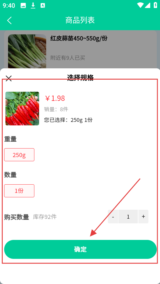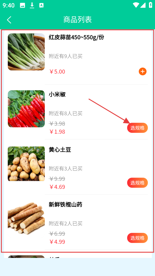 2、进入商品列表,能看到【红皮蒜苗】【小米椒】这些商品,旁边有“选规格”,点击就能挑合适规格哟。