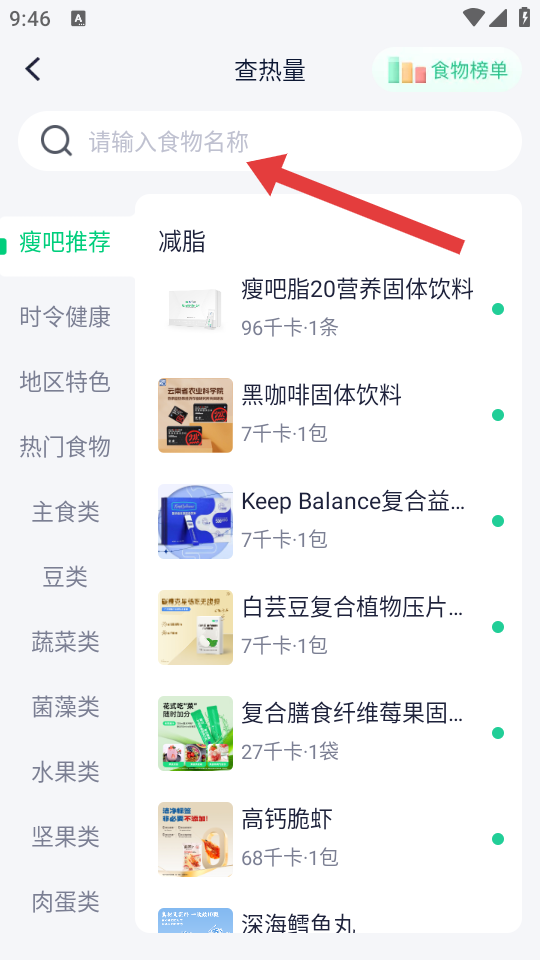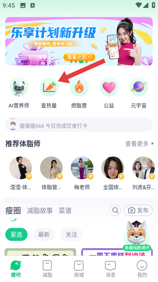 1、打开瘦身减脂APP,在【瘦吧】页面点击【查热量】图标。