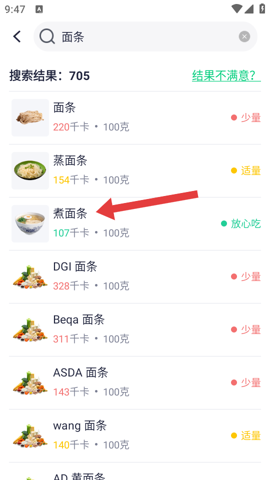 3、在搜索结果中,选择对应的食物,如【煮面条】。