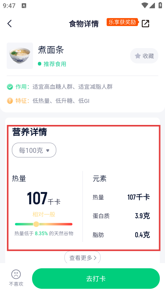 4、进入【食物详情】页面,查看【营养详情】部分,获取该食物每100克的热量及营养元素信息。