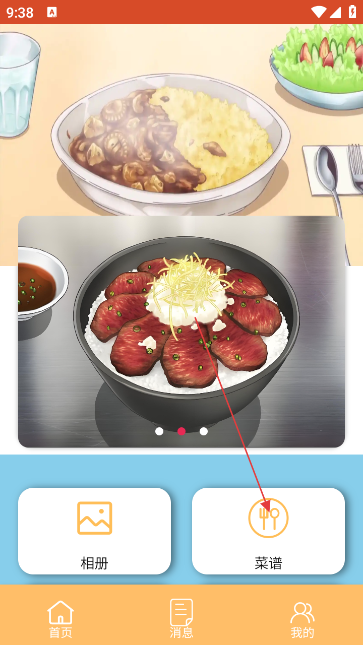 1、进入软件首页,能看到美食展示,想找菜谱就点击【菜谱】按钮。