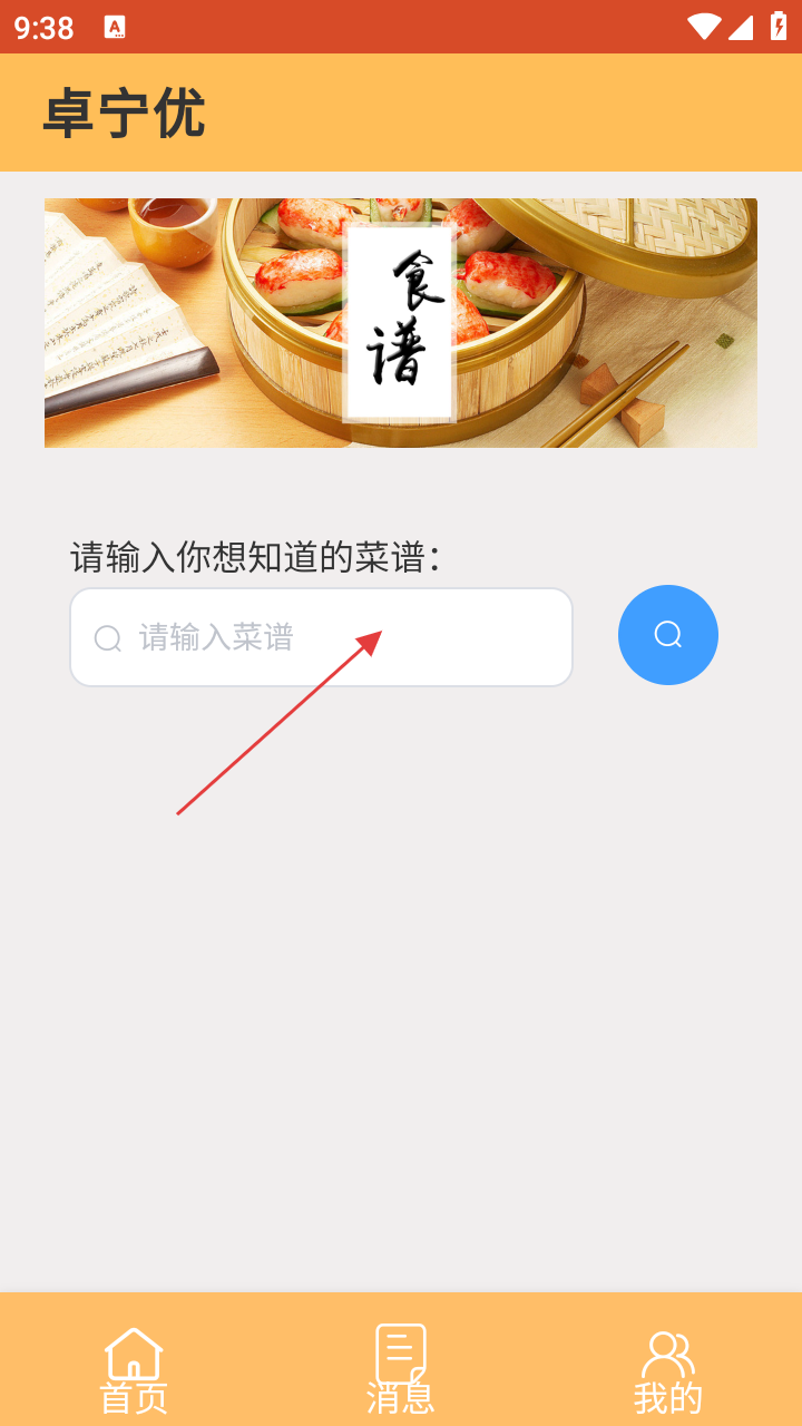 2、在菜谱页,有搜索框,提示【请输入你想知道的菜谱】,点击搜索框准备输入。