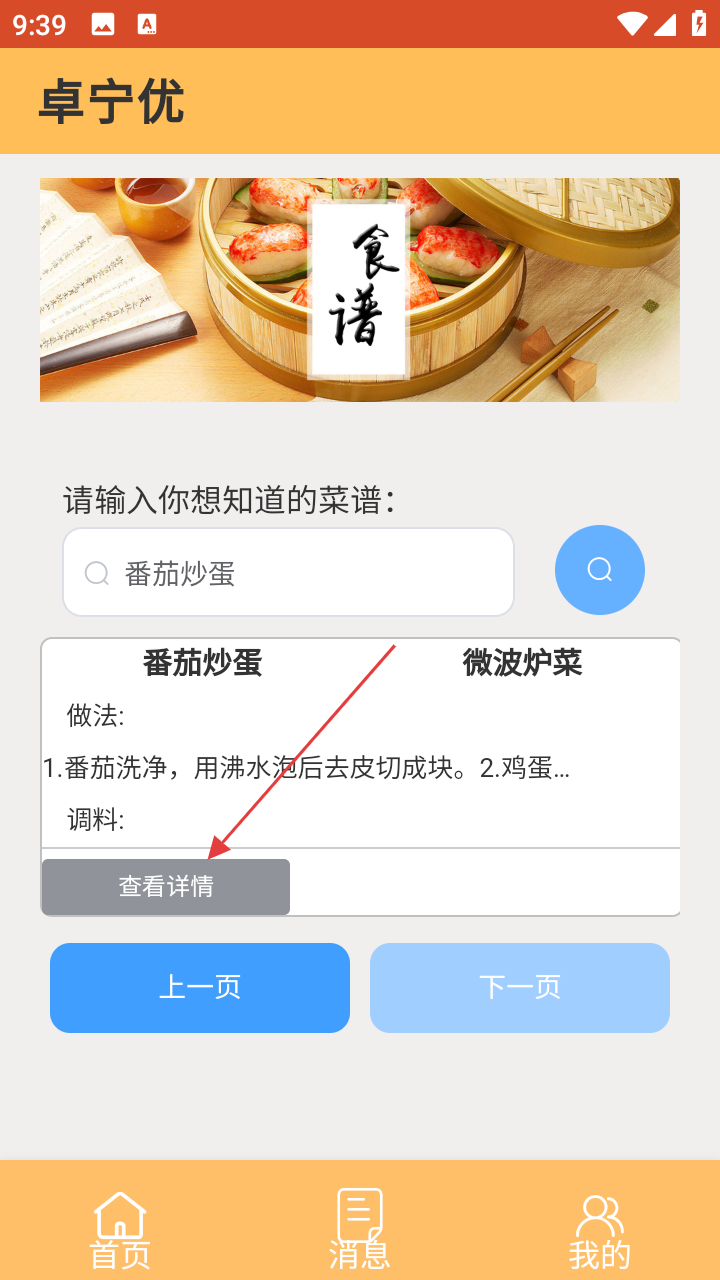 3、在搜索框输入菜谱名,比如【番茄炒蛋】,会出现相关菜谱,点击【查看详情】。