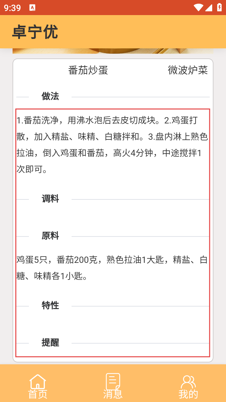 4、进入详情页,能看到【番茄炒蛋】的做法、调料、原料等详细信息,方便学习制作。