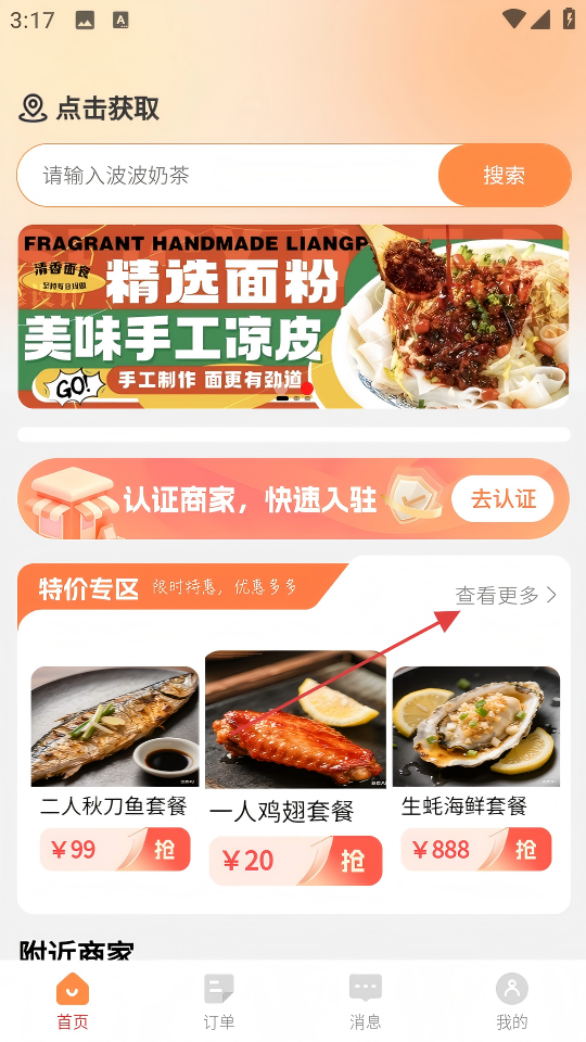 1、进入应用首页,在特价专区点击【查看更多】,浏览更多特价商品。