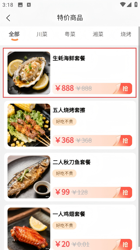2、在特价商品页面,挑选心仪的美食,如【生蚝海鲜套餐】。