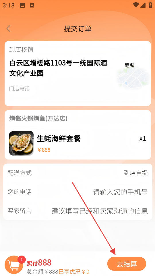 4、在提交订单页,确认店铺地址等信息后,点击【去结算】,完成下单。
