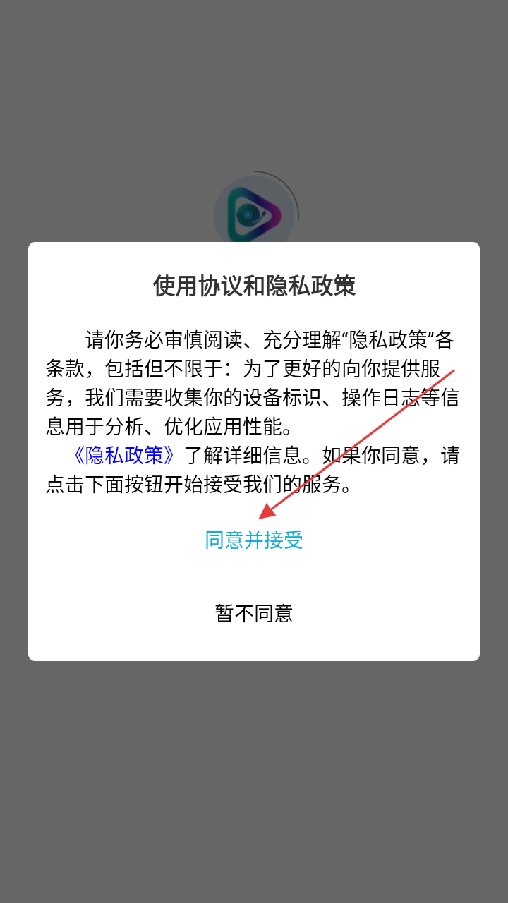 1、打开目标应用,页面弹出【使用协议和隐私政策】提示框,点击【同意并接受】按钮,进入应用登录页面。