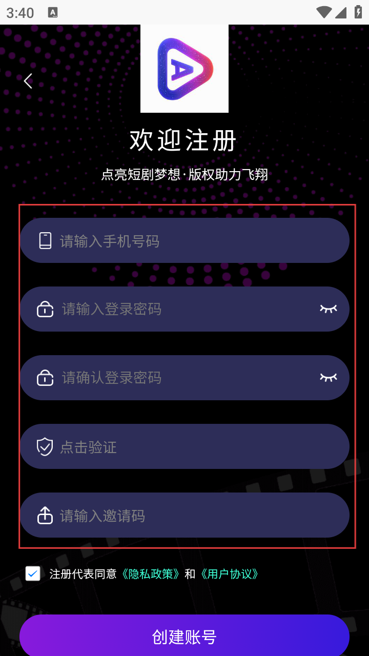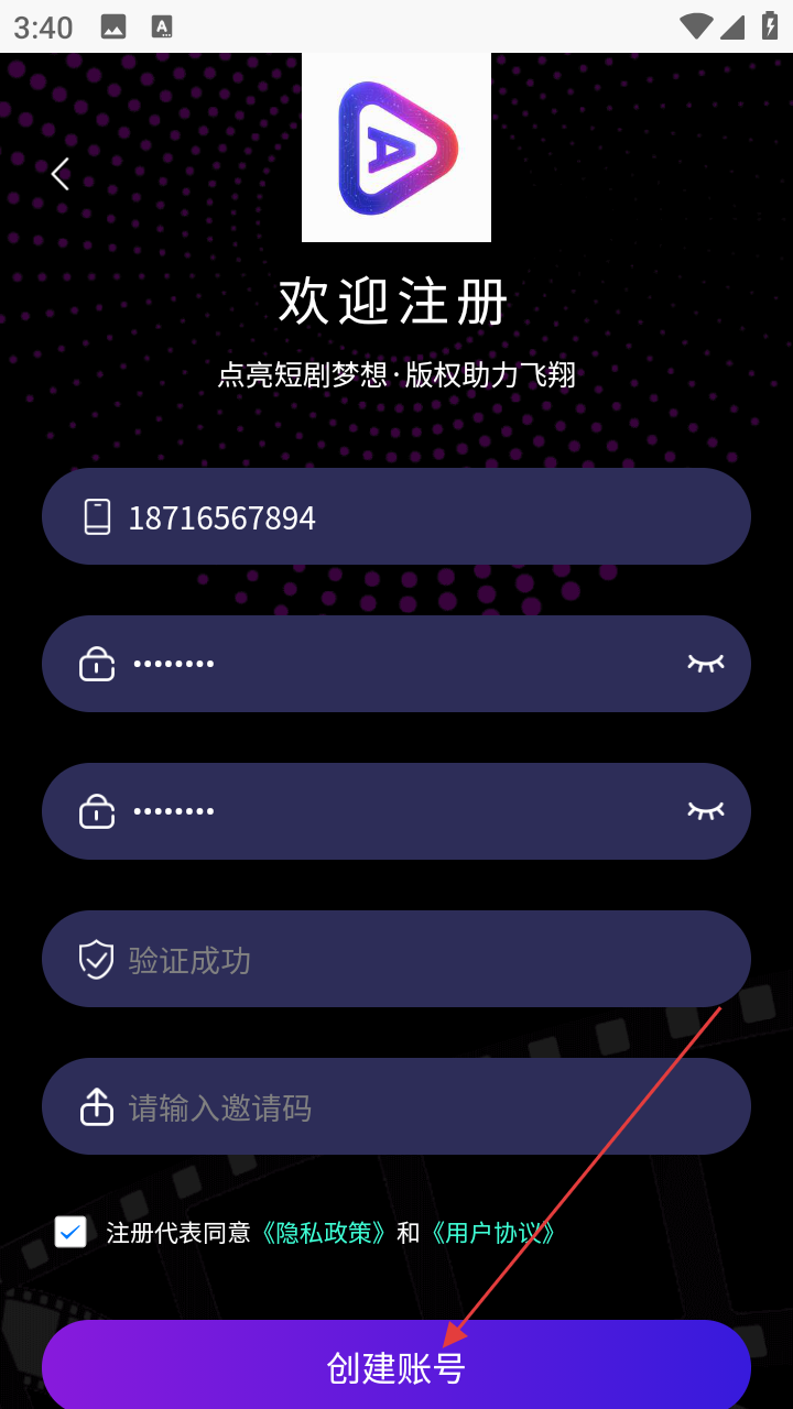 3、在注册页面,依次完成【手机号码】输入、【登录密码】设置、【确认登录密码】填写,按提示完成验证;最后勾选【注册代表同意《隐私政策》和《用户协议》】。