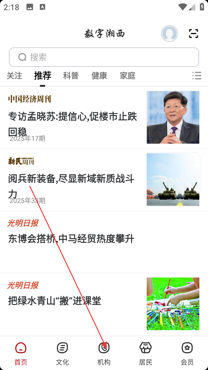 1、打开“数字湘西”应用,在首页底部导航栏中找到并点击【机构】选项,进入机构分类页面。