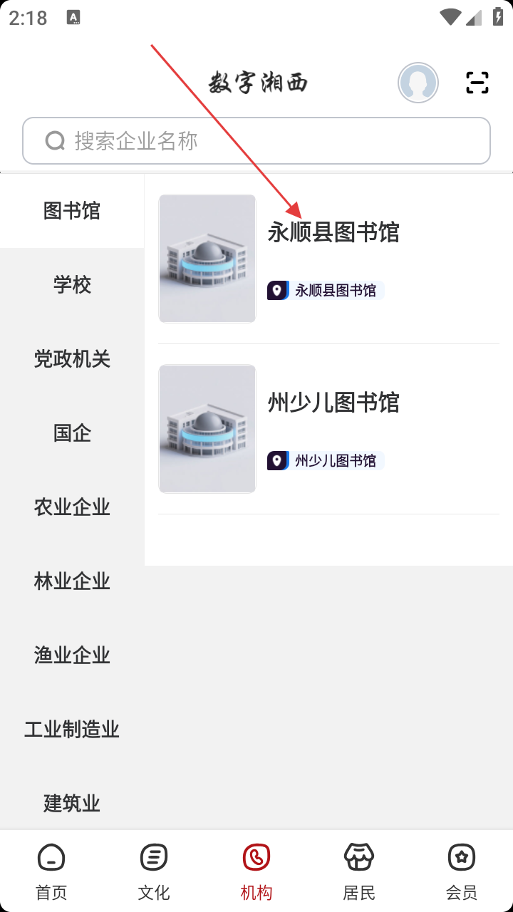 2、在机构页面的图书馆分类板块下,找到并点击【永顺县图书馆】选项,跳转至该图书馆专属页面。
