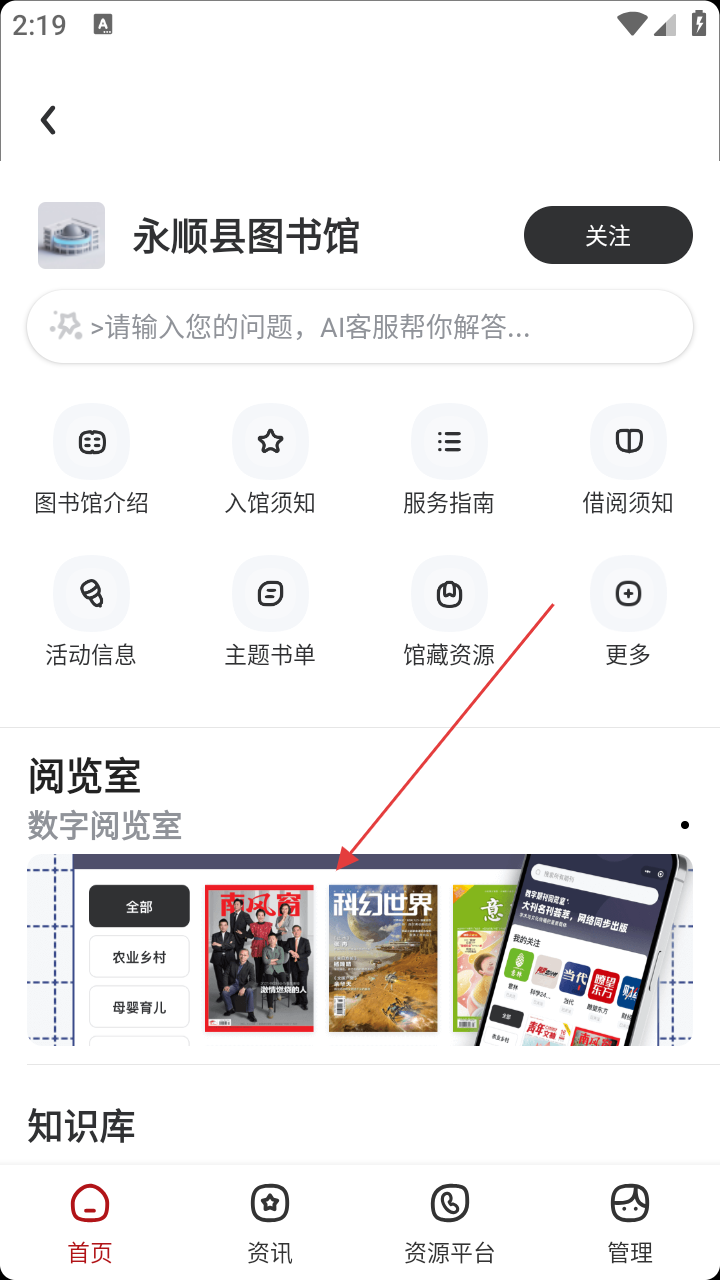 3、在永顺县图书馆页面中,找到并点击【数字阅览室】相关区域,进入数字资源浏览页面。