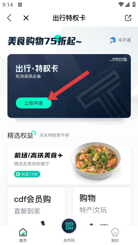 2、在出行特权卡页面中,点击【立即开通】按钮,进入开通会员界面。