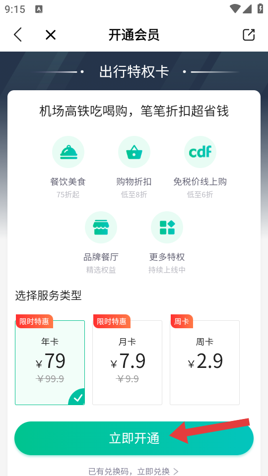 3、在开通会员界面,选择想开通的服务类型,如年卡、月卡或周卡,选好后点击【立即开通】。