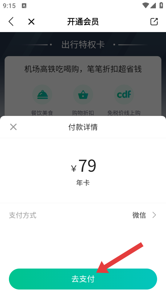 4、在付款详情页面,确认支付金额和支付方式,无误后点击【去支付】,完成出行特权卡的开通。