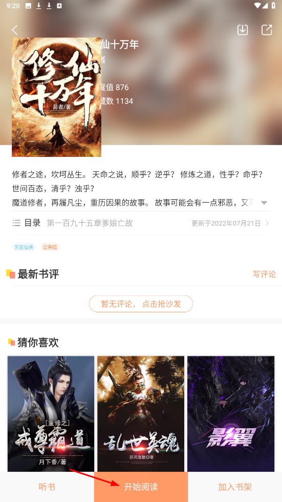 3、进入小说详情页后,点击【开始阅读-功能按钮】,进入阅读界面。