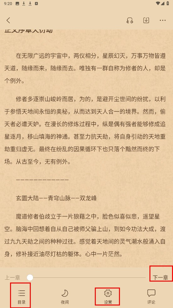 4、在阅读界面,可点击【目录】【设置】等按钮,也能点击【下一章】继续阅读。