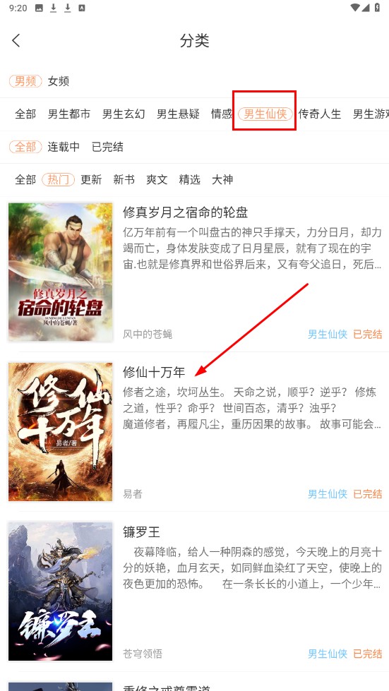 2、在分类页选择【男生仙侠-分类标签】,找到《修仙十万年》并点击。