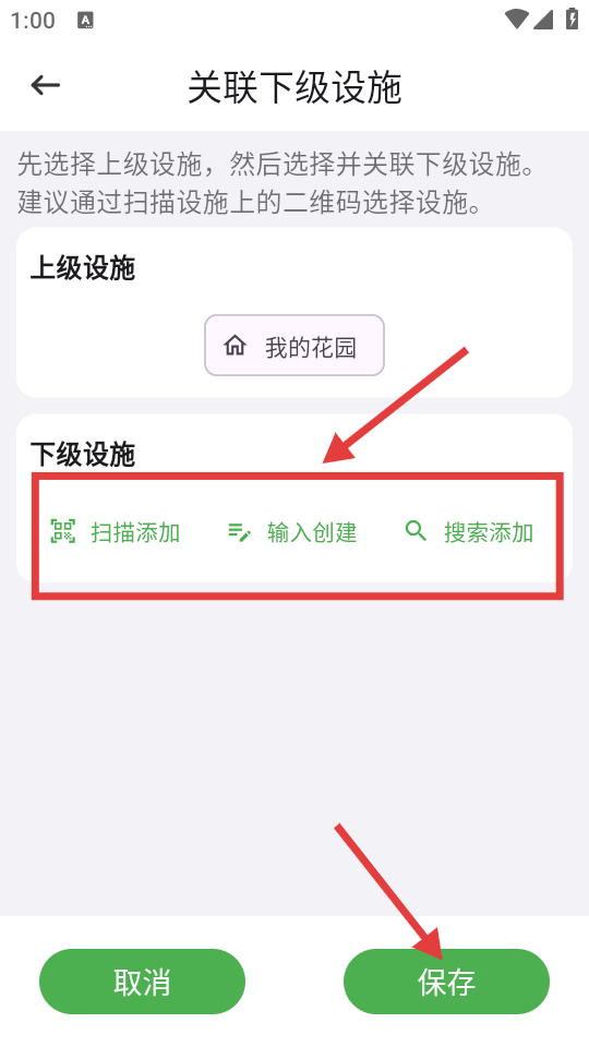 4、在关联下级设施页面,选择下级设施的添加方式,添加好下级设施后,点击【保存】按钮,即可完成设施关联。