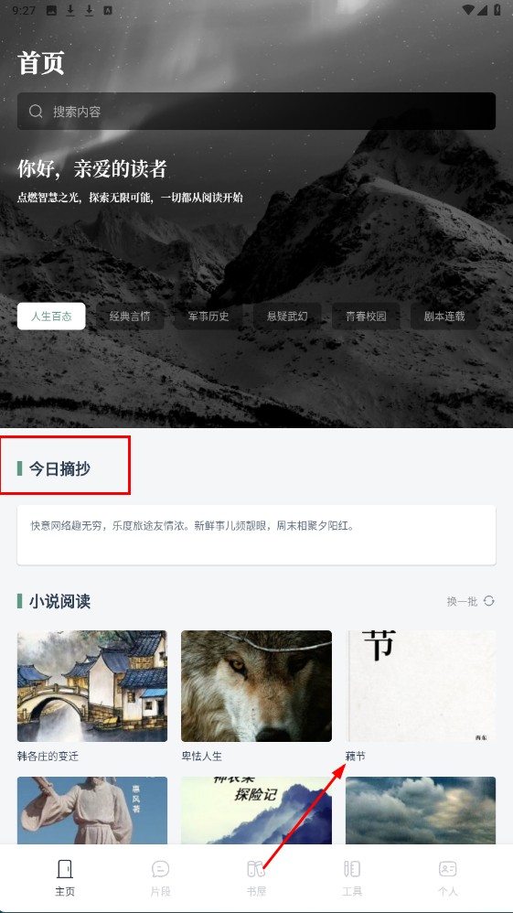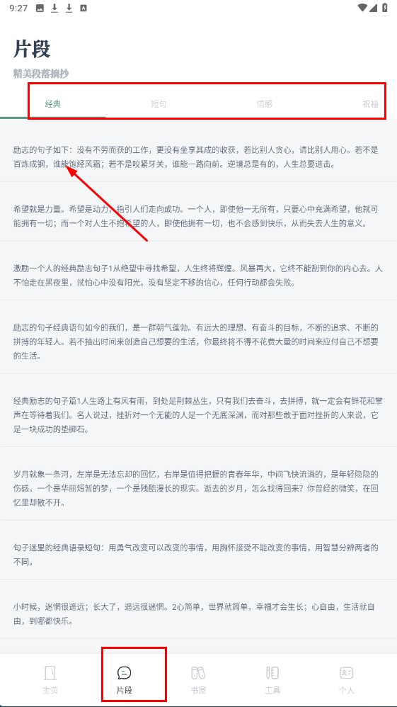 3、点击底部【片段-功能按钮】,进入片段页,可看经典等分类下的美段落摘抄。