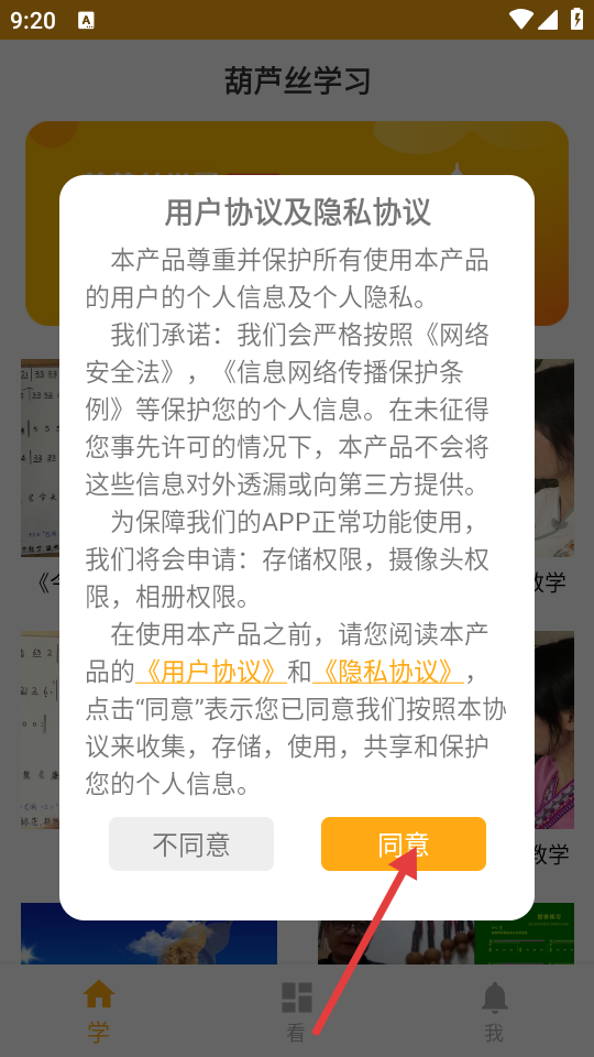 1、打开APP,在弹出的“用户协议及隐私协议”弹窗中,点击【同意】按钮。