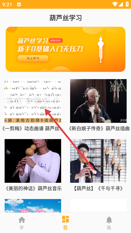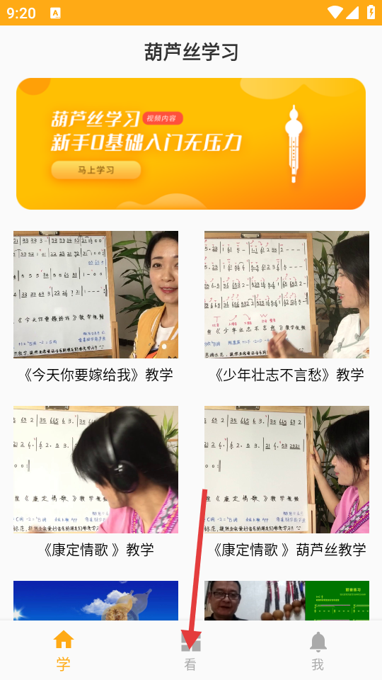 2、进入APP主页面后,点击底部【看】选项,进入葫芦丝学习内容展示页面。