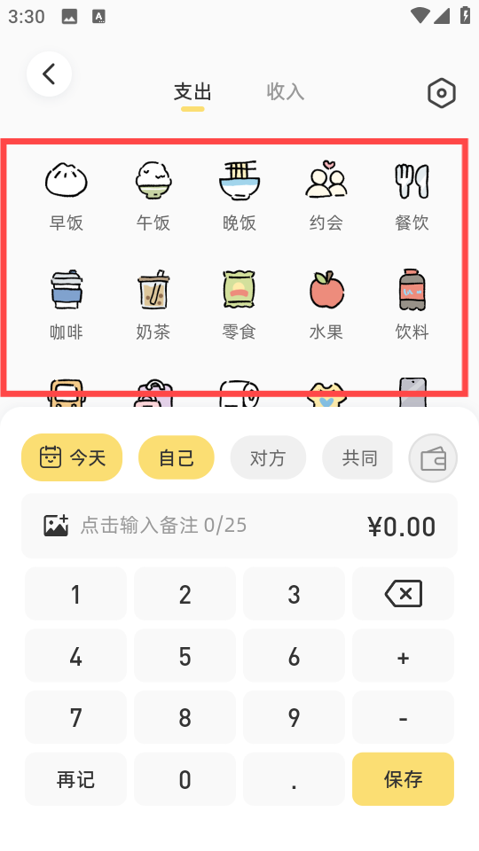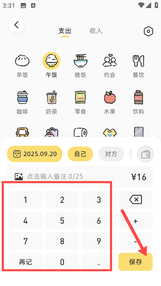 2、进入账单添加页面,在【支出】分类下,可选择【早饭】【午饭】【晚饭】等消费分类图标。