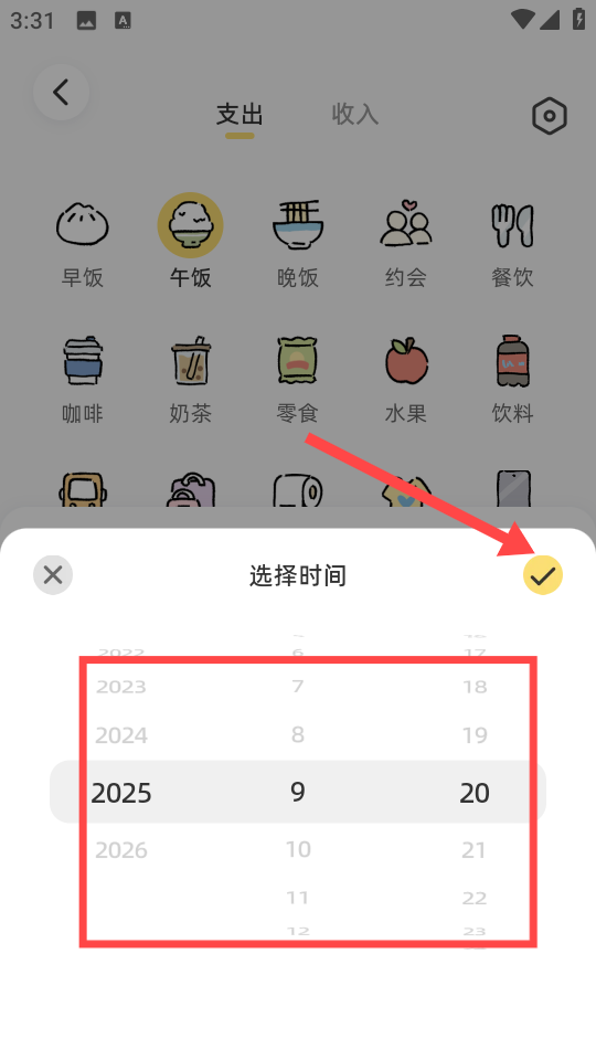 3、在选择时间弹窗中,选择对应的年份、月份、日期后,点击右上角对勾,确认时间选择。
