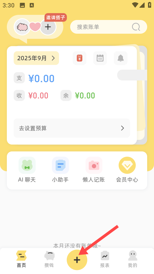 1、在软件首页,可查看本月收支等情况,点击底部黄色【+】号,进入账单添加页面。