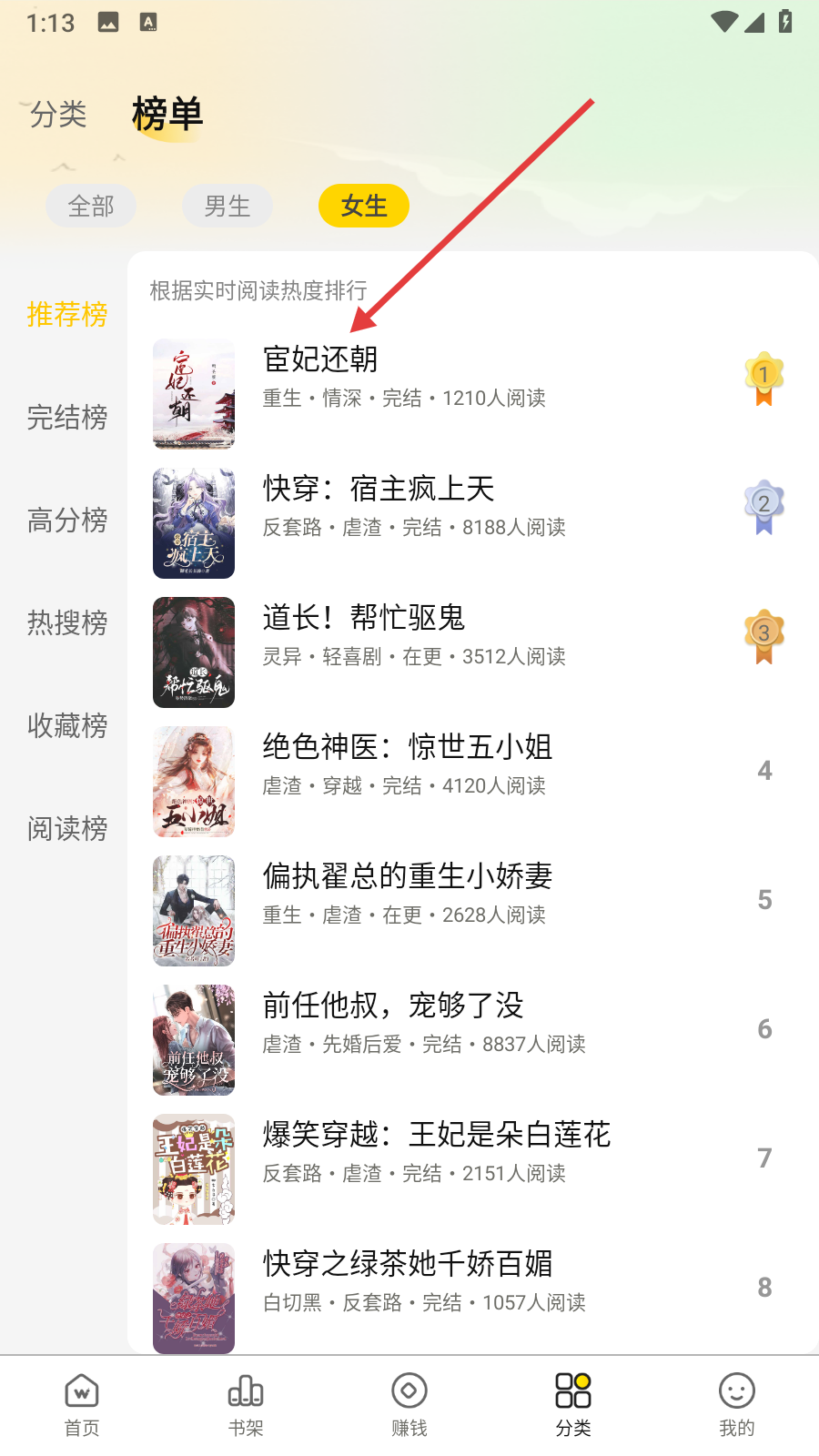 2、在榜单中选择感兴趣的书籍,如【宦妃还朝】。