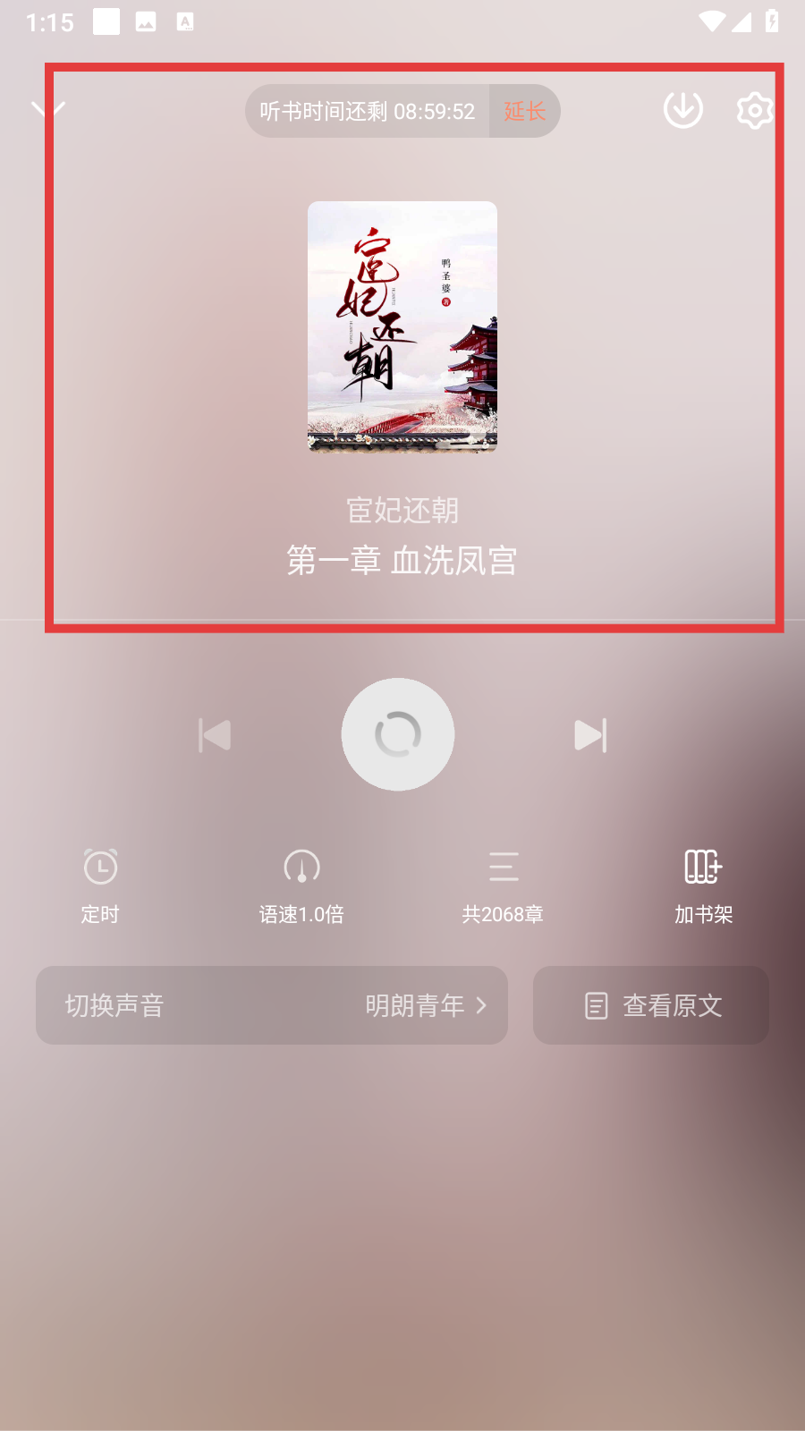 4、在听书界面,可查看书籍相关信息,还能设置定时、语速等。