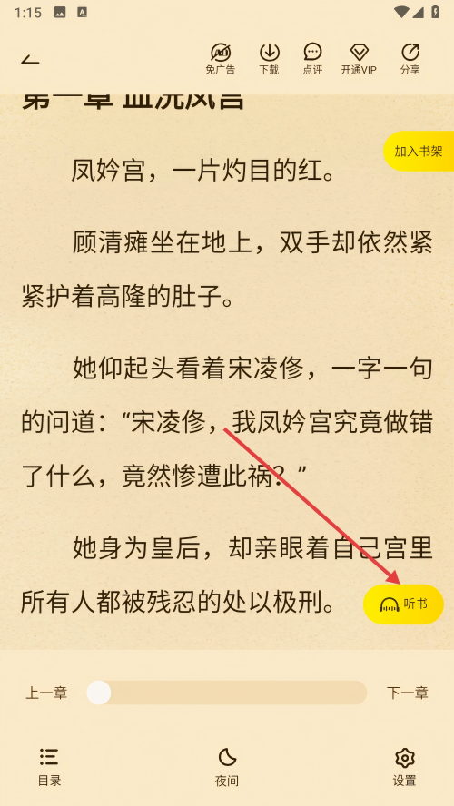 3、进入书籍阅读页面后,点击【听书】按钮,可切换为听书模式。