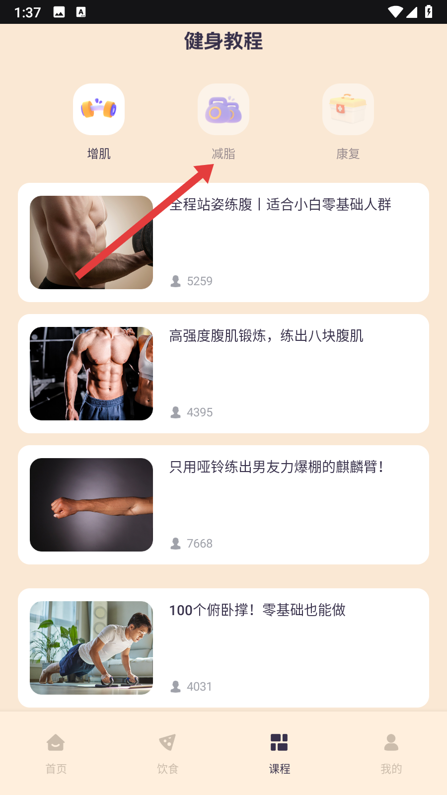 2、在健身教程板块,选择【减脂】分类,查看减脂相关课程。