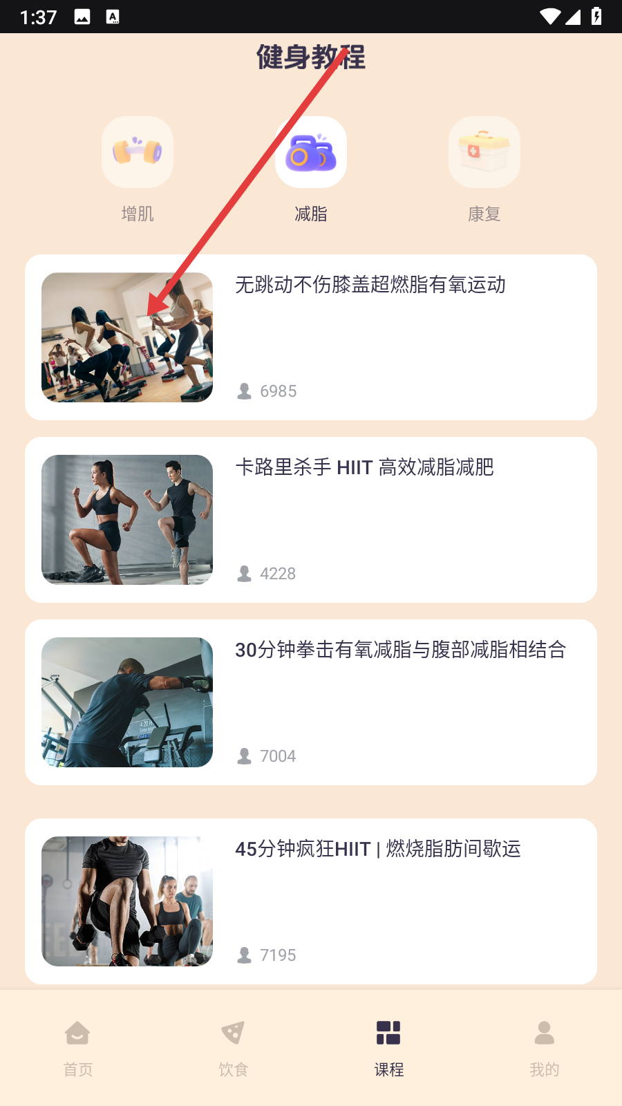 3、在减脂课程列表中,选择感兴趣的课程,如【无跳动不伤膝盖超燃脂有氧运动】。