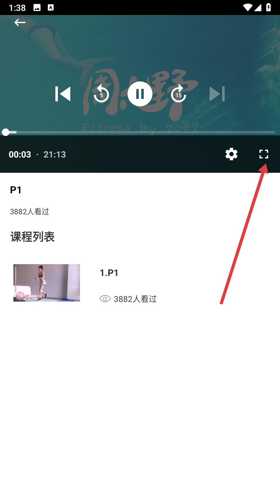 4、进入课程播放页面后,可点击全屏按钮,更好地观看课程内容。