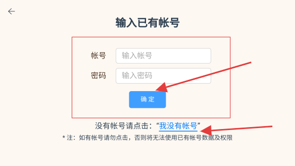 3、选择【帐号登录】后,在【帐号】和【密码】处输入信息,点击【确定】;若没有帐号,点击【我没有帐号】。
