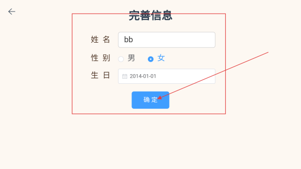 4、进入【完善信息】界面,填写【姓名】,选择【性别】,填写【生日】,然后点击【确定】。