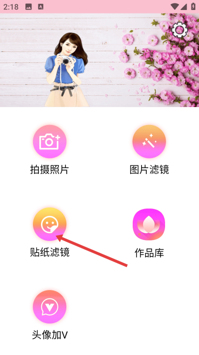 1、打开软件,点击【贴纸滤镜】功能,进入图片选择界面。